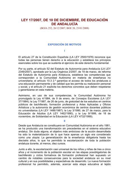 La Ley de Educación de Andalucía 17/2007: Todos los detalles EXPOSICIÓN DE MOTIVOS La Ley de Educación de Andalucía 17/2007, aprobada el 10 de diciembre, representa un hito importante en el sistema educativo de la comunidad autónoma. Esta ley tiene como objetivo principal garantizar una educación de calidad, equitativa, inclusiva y adaptada a las necesidades … Leer más