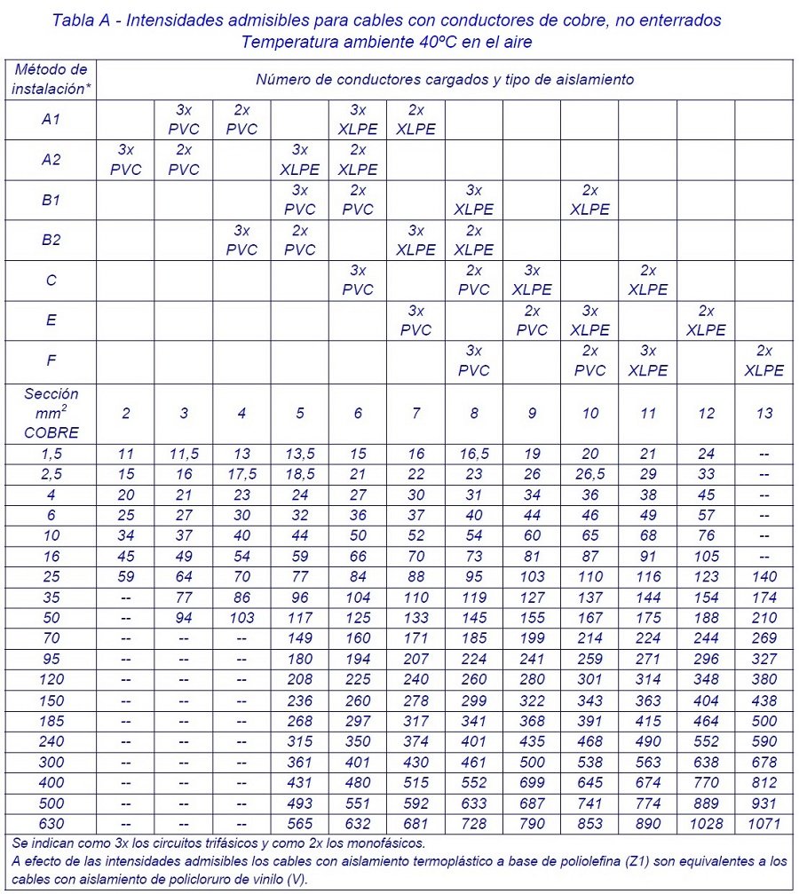 Tablas con la intensidad máxima admisible para conductores de cobre